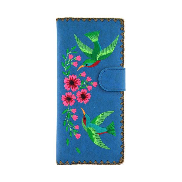 Made with Eco-friendly, materials, this vegan leather bifold features two embroidered hummingbirds and framed with decorative stitches. Approximately 3.5" x 7.5" x 0.6" and snaps to close.